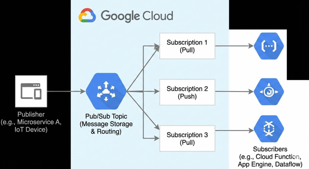 The brilliant part is that multiple, different services can subscribe to the same topic. The “shipping” service can also create its own subscription to the order-confirmations topic. When a single message is published, Pub/Sub delivers a copy of that message to each subscription independently.